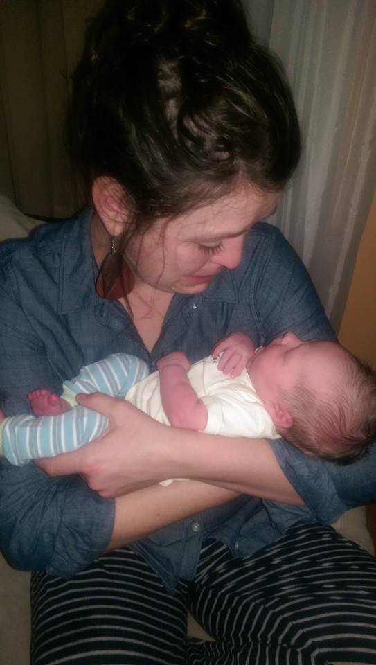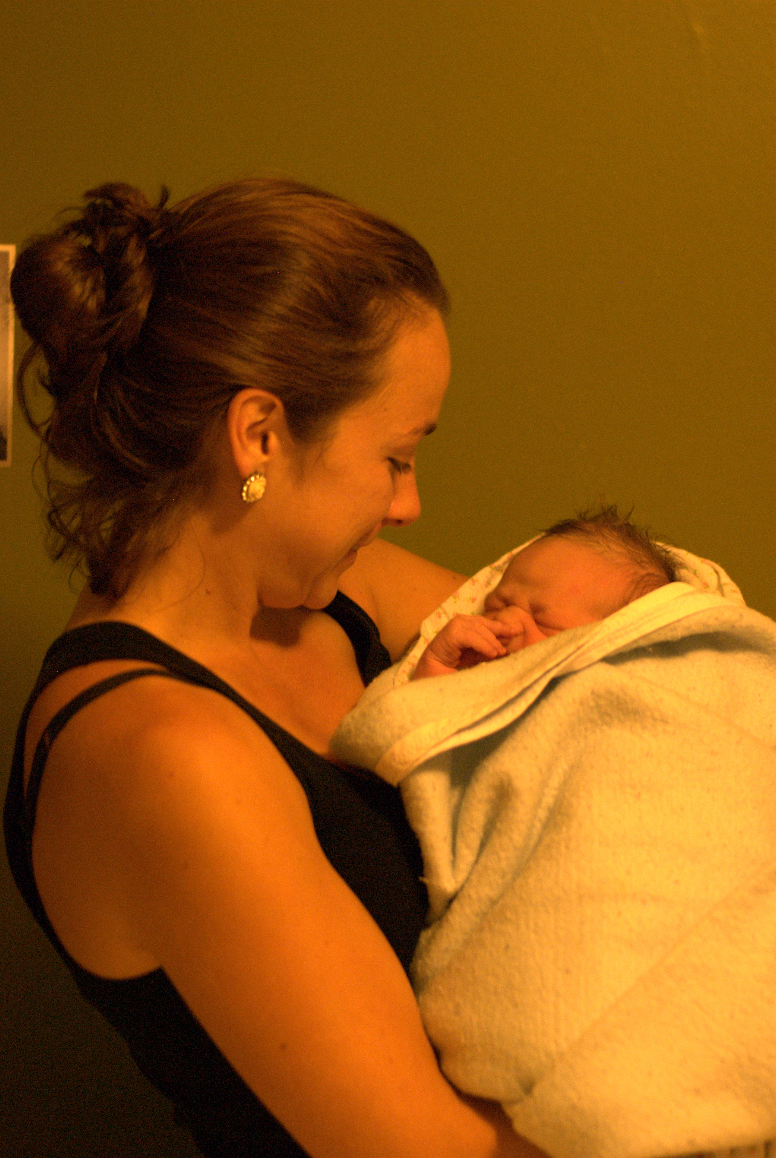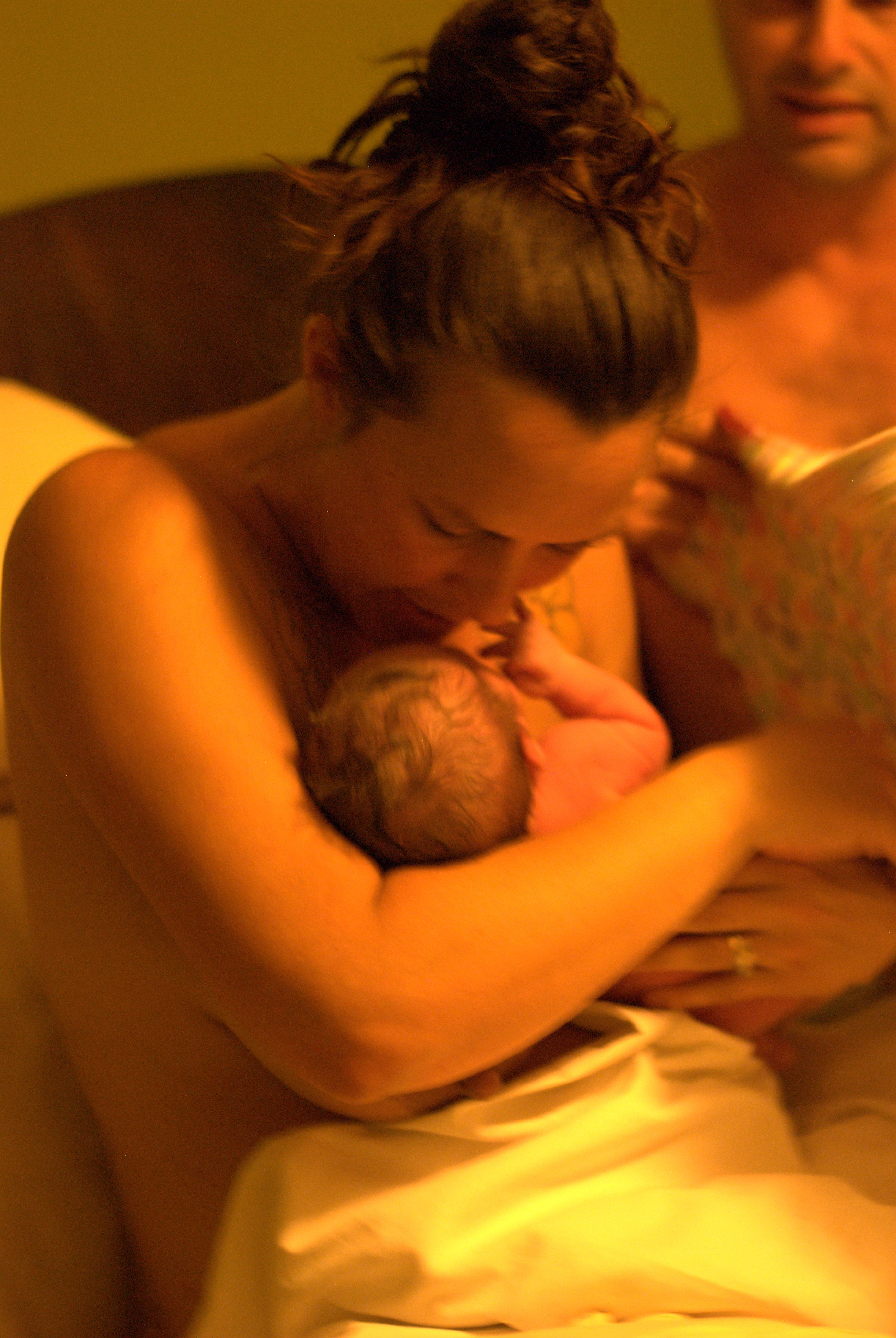 She is covered in thick, cheesy vernix. I am in love with her. There is no one else in the room. We have a daughter. A daughter! She is perfect and beautiful, immediately announcing her arrival with grunts and sobs. Her cord is short, so I ask to get out of the water and into bed.